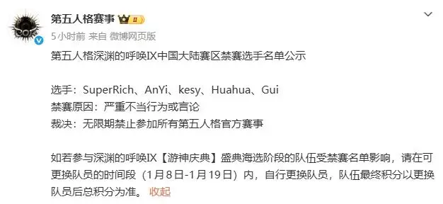 第五人格五名选手被永久禁赛,原因包括:谈未成年、发不雅照等。