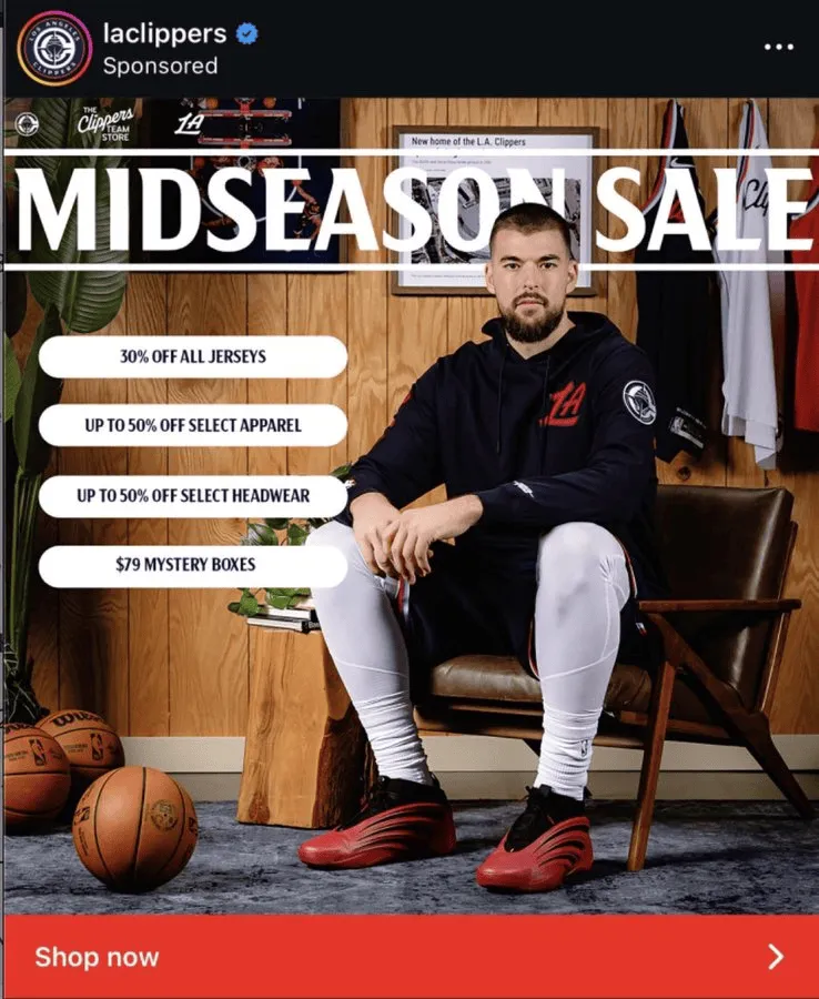 虎扑01月16日讯 近日,快船官方账号在社媒投放了一则广告,画面中由中锋祖巴茨出镜,主打球衣、服饰与周边折扣。